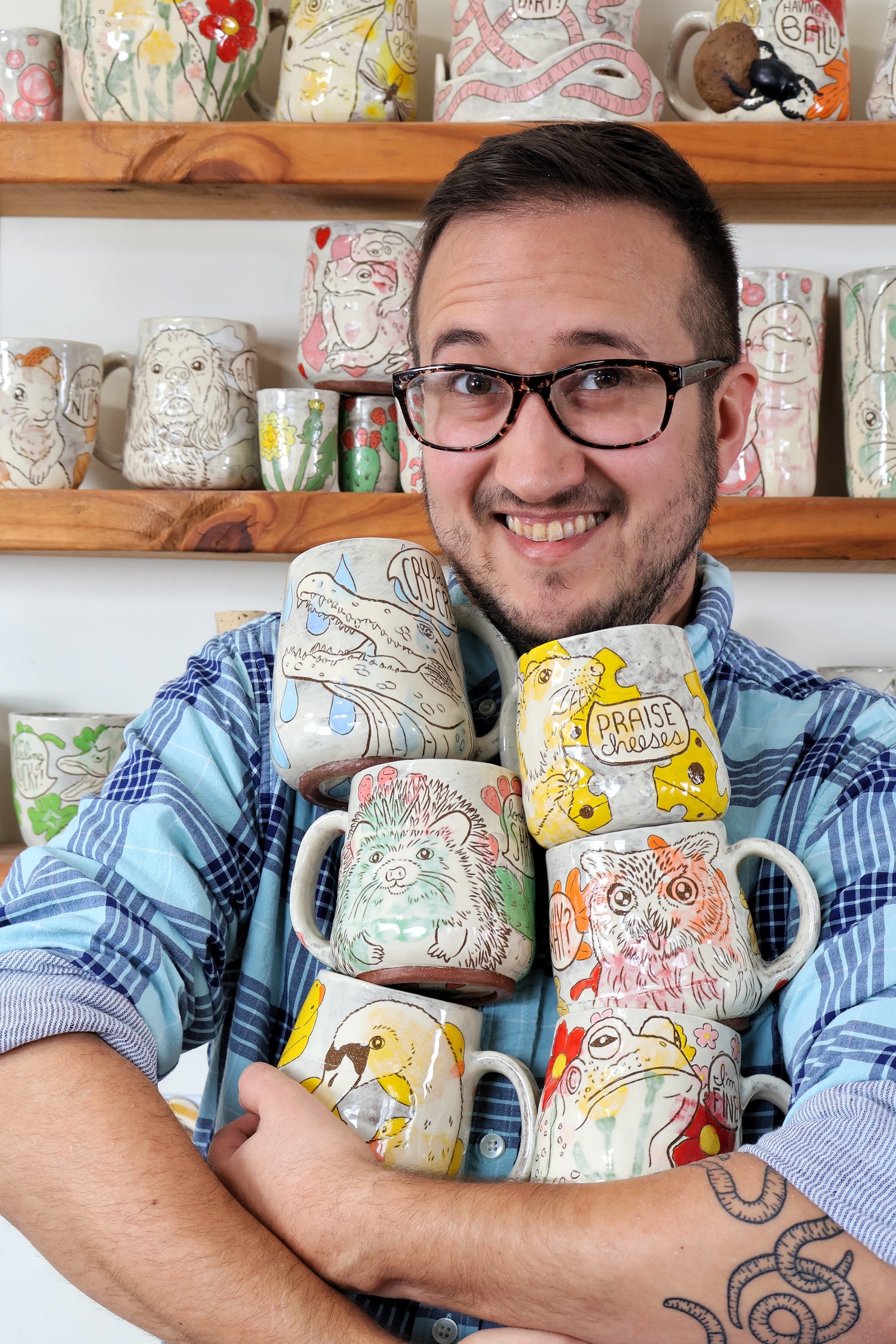 Hello and welcome! I'm Milo Berezin, a ceramic artist in Pittsburgh, Pennsylvania. My ceramics are all hand-built and individually decorated with underglaze and slip. I'm a full-time parent and a part-time artist, and I live with my husband, kiddo, and way too many critters.